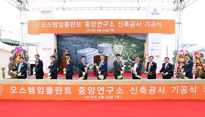 오스템임플란트(이하 오스템)가 지난달 28일 서울 마곡지구에서 중앙연구소 신축 기공식을 진행했다. 이날 기공식에는 오스템 임직원을 비롯해 서울 강서구청 및 건설사 관계자 등 100여명이 참석했다.
