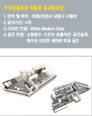 우리들치과는 화이트 모던한 세련된 스타일을 갖추고, 인위적이지 않은 편안한 느낌을 표현했다. 깔끔하고 세련된 스타일로 소형치과의 단점을 시각적으로 보완해 현대적인 감각과 안정감, 여유로움까지 갖춘 공간으로 재탄생했다. 안내 데스크는 사선벽체의 공간특성에 맞도록 배치돼 고객접견을 원활하게 하고, 대기공간에서도 간이 상담이 가능한 상담테이블을 접목시켰다. 환자 대기실은 치과로고의 아이덴티티 색상을 반영한 화이트 모던 스타일의 가구로 포인트를 주었다.