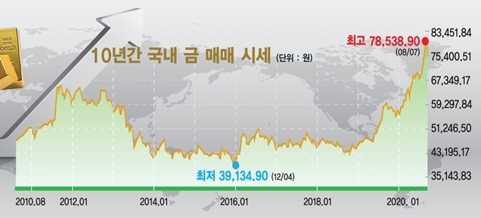 금값의 상승세는 심상치 않다. 실물거래를 기준으로 살 때와 팔 때 가격의 중간값인 매매기준율을 보면 지난 18일 1g당 가격은 7만6,417원. 한 돈(3.75g)에 28만6,563원이다. 8월 7일 최근 10년 내 최고 매매기준율인 7만8,538원을 찍고 소폭 조정을 받더니, 다시 상승추세로 돌아섰다.