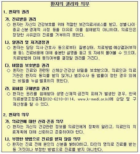 의료기관에 게시해야 할 내용은 보건의료기본법 등 의료관련 법률이 정한 6개 항목으로, 구체적으로는 △진료 받을 권리 △알권리 및 자기결정권 △비밀을 보장받을 권리 △피해를 구제받을 권리 △의료인에 대한 신뢰·존중 의무 △부정한 방법으로 진료를 받지 않을 의무 등이다.