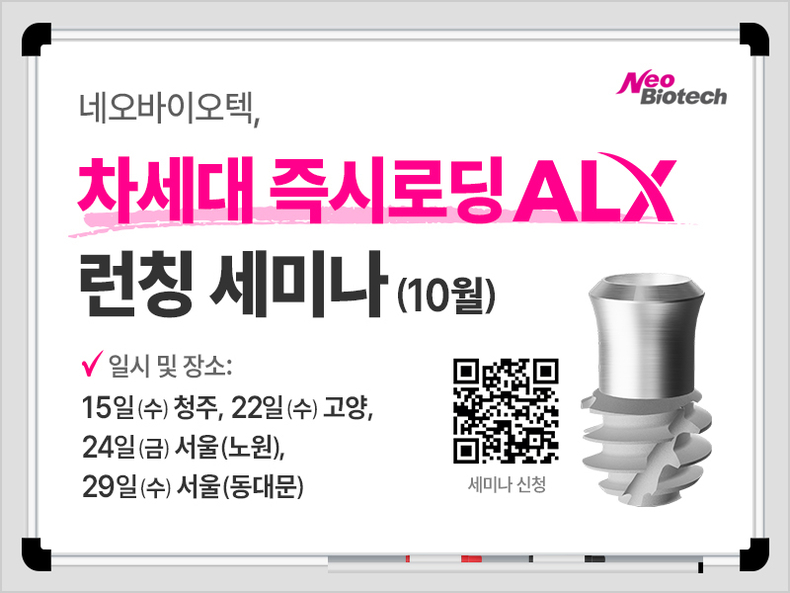 [치과신문_전영선 기자 ys@sda.or.kr] 네오바이오텍(대표 허영구·이하 네오)이 오는 10월 29일까지 고양, 서울 노원, 서울 동대문 등에서 즉시로딩 임플란트 ‘ALX 세미나’를 개최한다.