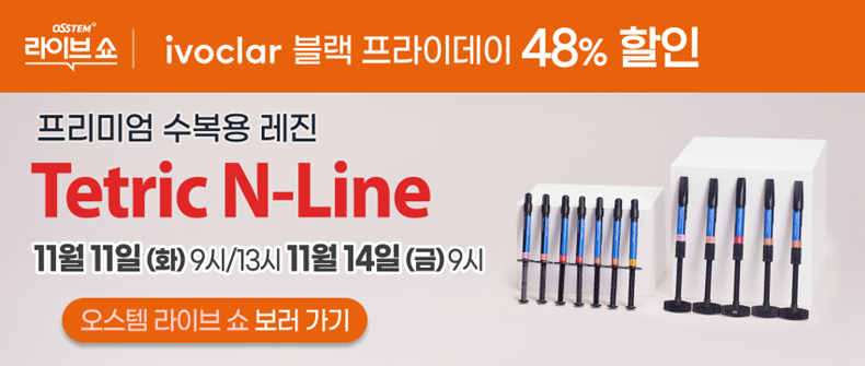 [치과신문_신종학 기자 sjh@sda.or.kr] 오스템임플란트(이하 오스템)의 ‘오스템 라이브쇼’가 오는 11월 11일부터 14일까지 Ivoclar(이보클라) 프리미엄 플로어블 레진 ‘Tetric N-Flow’와 패커블 레진 ‘Tetric N-Ceram’ 파격 할인 방송을 진행한다.