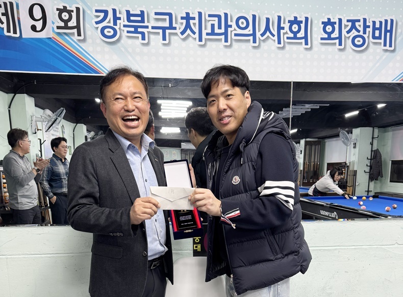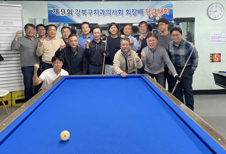 [치과신문_최학주 기자 news@sda.or.kr] 지난해 서울시치과의사회 회장배 당구대회 복식조에서 영예의 우승(손찬형·주현중 회원)을 차지한 강북구치과의사회(회장 박경오·이하 강북구회)가 제9회 회장배 당구대회를 성황리에 마무리했다.