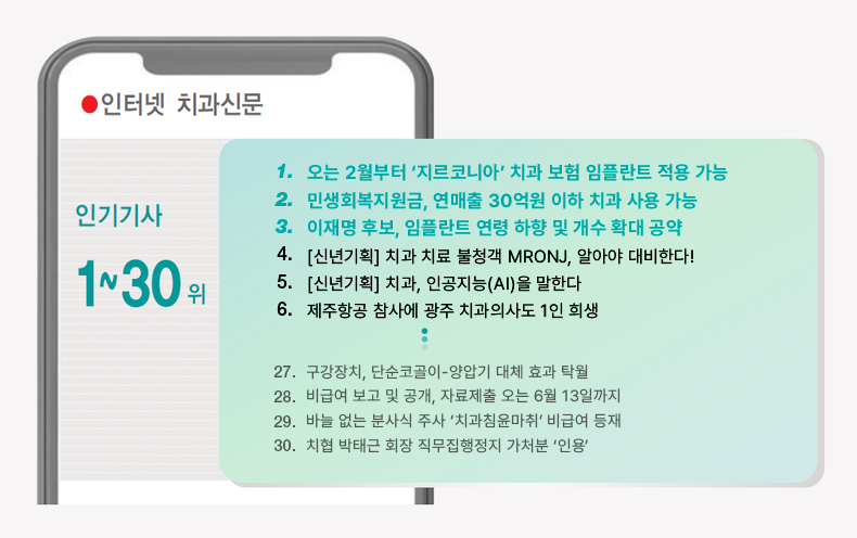 ‘조회수 Top 30’에서는 치과계 주요 변화와 논란 등 개원가 이슈를 전달한 기사를 다수 찾아볼 수 있었다. 인기기사 상위권을 살펴보면, 치과경영에 직접적인 영향을 미치는 제도·정책 변화에 독자들의 관심이 집중돼 있었다. 특히 보험, 비급여, 지원금, 규제 등 진료 현장과 수익 구조에 영향을 주는 이슈가 상위권에 랭크됐다.
