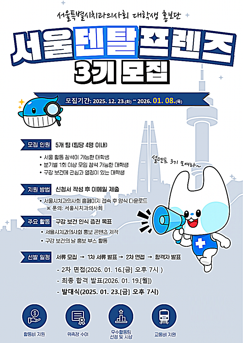 [치과신문_이가영 기자 young@sda.or.kr] 서울시치과의사회(회장 강현구·이하 서울지부)가 대학생홍보단 ‘설덴프(서울덴탈프렌즈)’ 3기를 모집한다. 서울지부는 대학생들의 색다른 시각과 아이디어를 통해 시민에게 구강보건의 중요성을 보다 친근하게 전달한다는 계획이다.