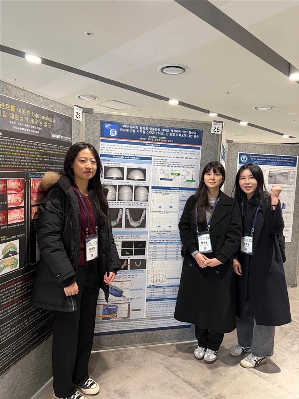 이 가운데 황서윤·김가현·양동효 학생은 ‘하악 무치악 환자의 임플란트 가이드 제작에서 마커 형상과 위치에 따른 디지털 스캔과 CT-STL 간 중첩 정확도에 대한 연구’를 발표해 포스터 부문 최우수상을 수상했다.