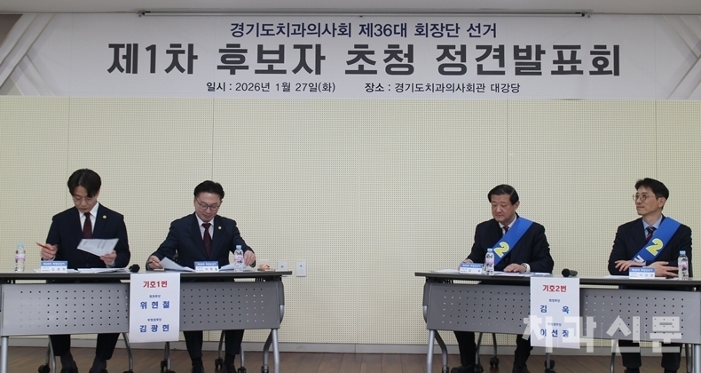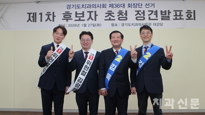 [치과신문_김영희 기자 news001@sda.or.kr] 경기도치과의사회(이하 경기지부) 제36대 회장단선거 정견발표회가 지난 1월 27일 경기지부 회관에서 개최됐다. 기호 1번 위현철-김광현 후보, 기호 2번 김욱-이선장 후보의 양자대결로 관심을 모으는 경기지부 회장단선거는 오는 2월 9일 실시된다.