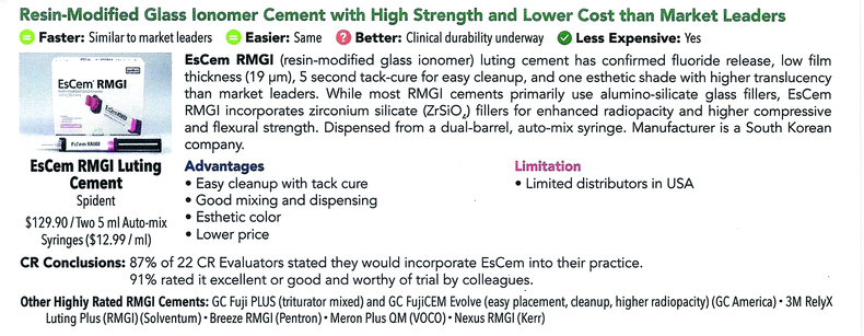 CR은 EsCem RMGI의 주요 특성으로 불소 방출, 적절한 피막 두께, 5초 택 큐어를 활용한 잉여 시멘트 제거의 용이성, 심미적 색상 구현 등을 언급했다. 또 일반적인 RMGI 시멘트가 알루미노-실리케이트 글라스 필러를 사용하는 것과 달리, EsCem RMGI는 지르코늄 실리케이트(ZrSiO₄) 필러를 적용해 방사선 불투과성을 높이고 압축강도와 굴곡강도 향상에 기여하도록 설계됐다고 소개했다.