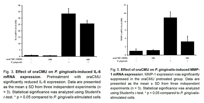 또한 이번 연구에서 주목할 점은 OraCMU가 잇몸 조직을 파괴하는 기질 분해 효소인 MMP-1과 MMP-3의 발현까지 억제했다는 사실. 이는 OraCMU가 단순한 항염증 효과를 넘어, 임플란트를 지지하는 주변 조직이 무너지는 것을 막아 구조적 안정성을 유지하는 데 기여할 수 있음을 시사한다.