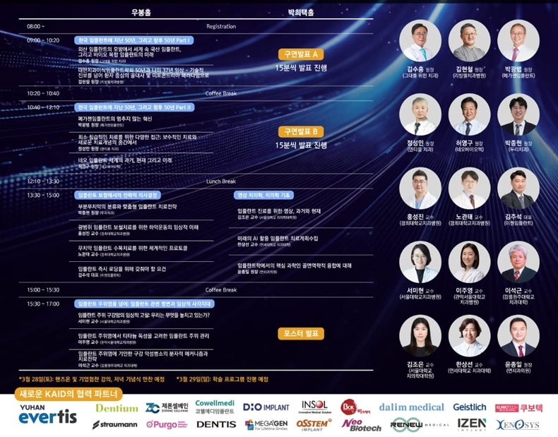 또한 김현철 前회장이 KAID의 50년을 짚어주고, 환자 중심의 치과치료 패러다임의 변화를 보여줄 예정이다. 이밖에도 홍성진, 노관태, 서미현, 이주영, 이석근, 김조은, 한상선 등 차세대 주자로 주목 받고 있는 교수들과 박종현 원장과 윤종일 원장, 그리고 김주석 대표 등이 최신 지견을 공유할 예정이다.