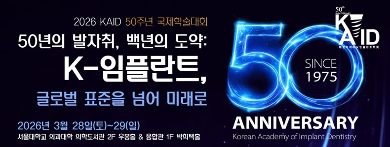 [치과신문_신종학 기자 sjh@sda.or.kr] 대한치과이식임플란트학회(회장 김성민·이하 KAID)가 오는 3월 28일과 29일 양일간 서울대학교 의과대학 의학도서관에서 ‘2026 KAID 50주년 국제학술대회’를 개최한다.