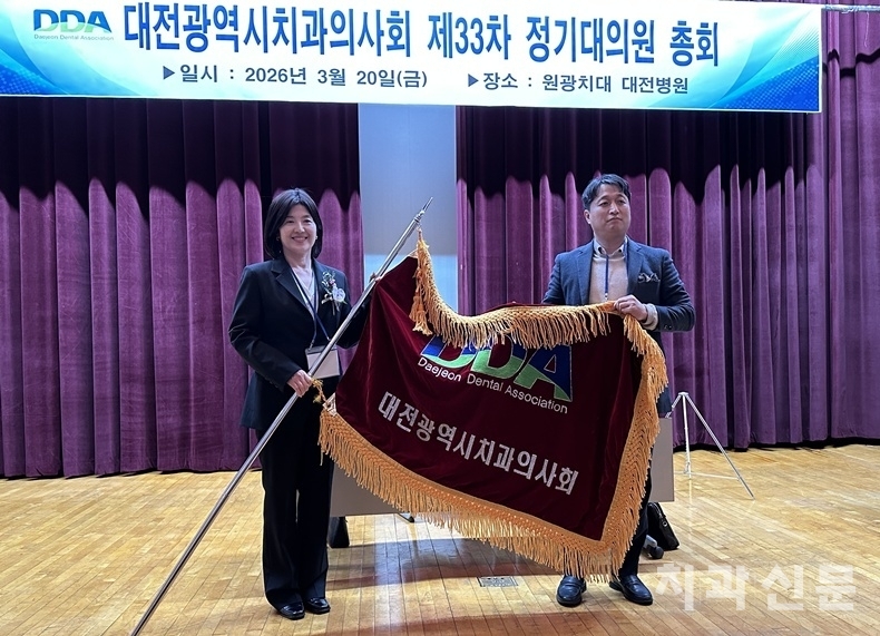 [치과신문_신종학 기자 sjh@sda.or.kr] 대전광역시치과의사회(회장 김광호·이하 대전지부)가 지난 3월 20일 원광대학교대전치과병원 대강당에서 제33차 정기대의원총회(의장 박재구)를 개최했다. 이날 총회에서는 지난 1월 대전지부 제14대 회장단 후보로 단독 입후보해 무투표로 당선된 김미중 회장 당선인과 백승천 부회장 당선인에 대한 당선증 수여식이 진행됐다.