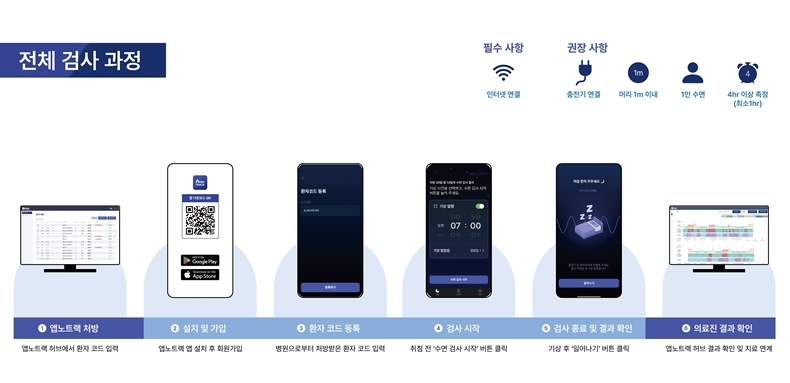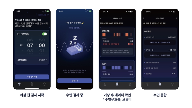 수면 중 수집된 호흡음 데이터는 AI 알고리즘으로 분석돼 관련 지표료 산출되며, 산출된 수면무호흡지수(AHI), 평균 코골이, 수면효율 등 검사결과는 의료진이 확인할 수 있는 웹페이지 대시보드 및 인쇄 가능한 리포트 형태로 제공된다. 환자도 본인의 스마트폰을 통해 압축된 결과를 확인할 수 있다.