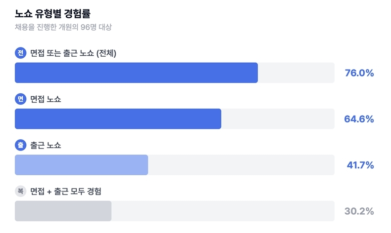 응답자 중 채용을 진행한 96명 가운데 면접 노쇼를 경험했다는 응답자는 64.6%, 출근 노쇼를 경험했다는 응답자는 41.7%인 것으로 확인됐다. 면접과 출근 모두 일방적인 취소를 당했다고 답한 치과의사도 30.2%에 달했다.