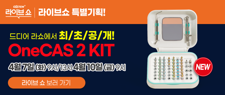 [치과신문_신종학 기자 sjh@sda.or.kr] OSSTEM 라이브쇼가 정식 론칭을 앞둔 ‘OneCAS 2 KIT’를 오는 4월 7일 최초로 공개, 사전예약 프로모션을 진행한다. 관계자는 “OneCAS 2 KIT는 지난 8년간 임상적 신뢰를 쌓아온 ‘OneCAS KIT’의 업그레이드 버전으로, 라이브쇼에서 2,300건 이상의 주문을 기록하기도 했다”고 밝혔다.