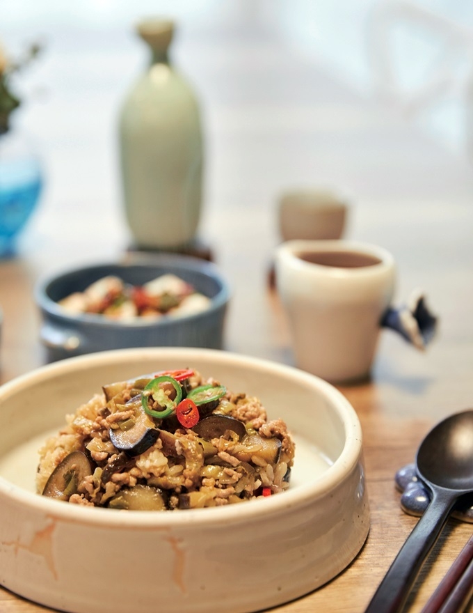 3. 냄비밥에 밥물이 바글바글 끓으면 약불로 줄이고 들기름을 한 스푼 넣은 뒤 재빨리 바닥부터 쌀을 전체적으로 뒤적여 들기름 코팅을 한다. 파기름에 볶은 가지와 돼지고기를 넣고 뚜껑을 덮은 뒤 약불에서 12분 조리 후 불을 끄고 5분간 뜸을 들인다.