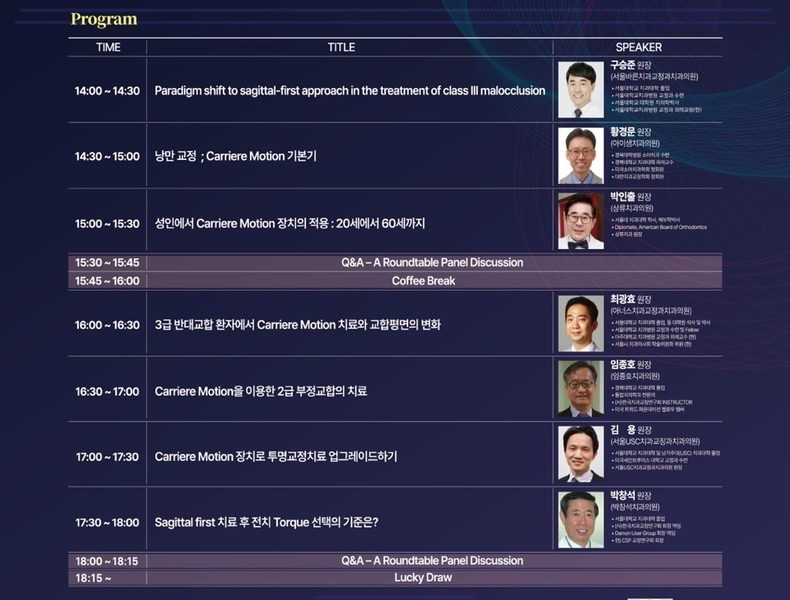 심포지엄에서는 구승준 원장(서울바른치과교정과치과의원)이 ‘Paradigm shift to sagittal-first approach in the treatment of class III malocclusion’을, 황경문 원장(아이샘치과의원)이 ‘낭만 교정; Carriere Motion 기본기’를, 박인출 원장(상류치과의원)이 ‘성인에서 Carriere Motion 장치의 적용:20세에서 60세까지’를 각각 다룬다.