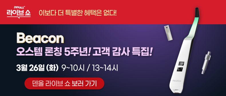 [치과신문_신종학 기자 sjh@sda.or.kr] 오스템임플란트(이하 오스템)의 라이브 커머스 덴올 라이브쇼가 ‘Beacon’ 론칭 5주년을 맞아 고객 감사 특집 방송을 진행한다. 오늘(26일) 단 하루 동안 200대 한정 물량으로 선보이는 만큼 치과 임상의들의 관심도 폭발할 것으로 기대된다.