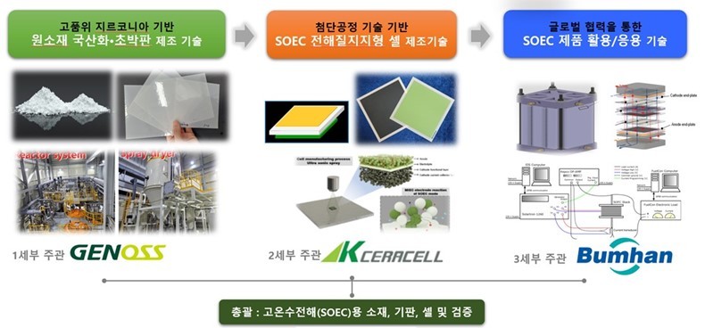 세부과제는 △원료분말 및 전해질 기판 개발(1세부) △셀·전극 소재 및 제조기술 개발(2세부) △스택 평가·진단 기술 개발(3세부)로, 고품위 지르코니아 기반 원료 세라믹 소재를 국산화하고 전해질지지형 고온수전해 핵심부품 소재 및 제조기술을 개발하게 된다. 특히 개발 소재부품의 성능을 확보하기 위해 국산 SOEC 스택을 개발하고, 유수 해외기관과 협력연구를 수행해 스택의 안정성을 평가하는 기술을 확보한다는 계획이다.
