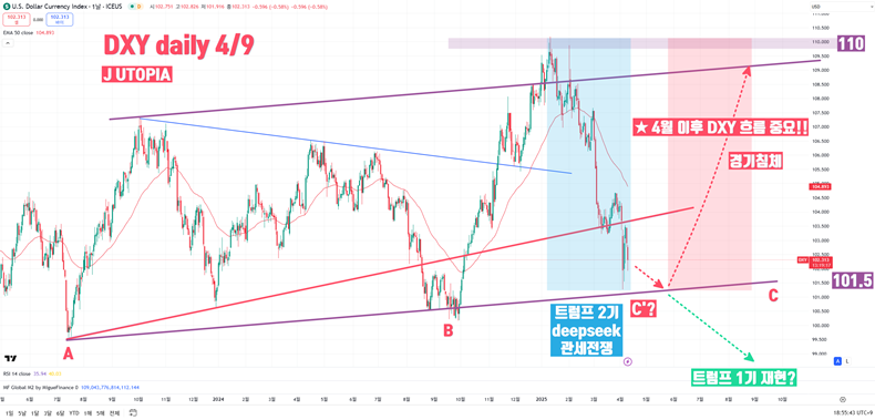 2025년 4월 16일 기준 연방준비제도(Fed)의 금리 사이클을 중심으로 한 주기적 자산배분 전략의 관점에서, 금리고점(A) 이후부터 경제위기(C)까지의 구간에서 위험자산의 마지막 상승 랠리가 발생하는 구간의 후반부에 속한다. 현재 시장은 금리 인하가 시작된 첫 단계(B)를 지나 경제위기(C)로 향하는 중반 과정에서 트럼프의 관세 전쟁으로 인해 변동성이 크게 확대된 상황이다. 일반적인 전통적인 금리인하 사이클의 경기침체 흐름과 달리 이번 위기는 미국채 금리가 급등하며 인플레이션 위험 속에 경기침체가 일어나는 스태그플레이션 가능성을 보여주고 있다. 여기에 미·중 패권 전쟁과 달러 패권의 지속가능성에 대한 의문이 더해져 더욱 복잡한 양상을 보인다.