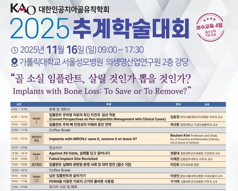 [치과신문_신종학 기자 sjh@sda.or.kr] 대한인공치아골유착학회(회장 이진한·이하 KAO)가 오는 11월 16일 가톨릭대학교 서울성모병원에서 2025년 추계학술대회(대회장 김좌영)를 개최한다. ‘골 소실 임플란트, 살릴 것인가 뽑을 것인가?’를 대주제로 열리는 이번 학술대회에서는 국내외 임플란트 관련 저명 연자들이 나서 다양한 지견을 펼칠 예정이다.