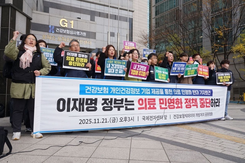 [치과신문_신종학 기자 sjh@sda.or.kr] 무상의료운동본부 등 건강보험 빅데이터 민간 개방저지 공동행동이 지난 11월 21일 용산 국제전자센터 앞에서 기자회견을 열고 “국민 개인건강정보 및 의료 기록을 보험사 등 영리기업에 넘기려는 시도를 중단하라”, “이재명 정부는 의료 민영화 정책 중단하라” 등 강력한 비판의 목소리를 냈다.