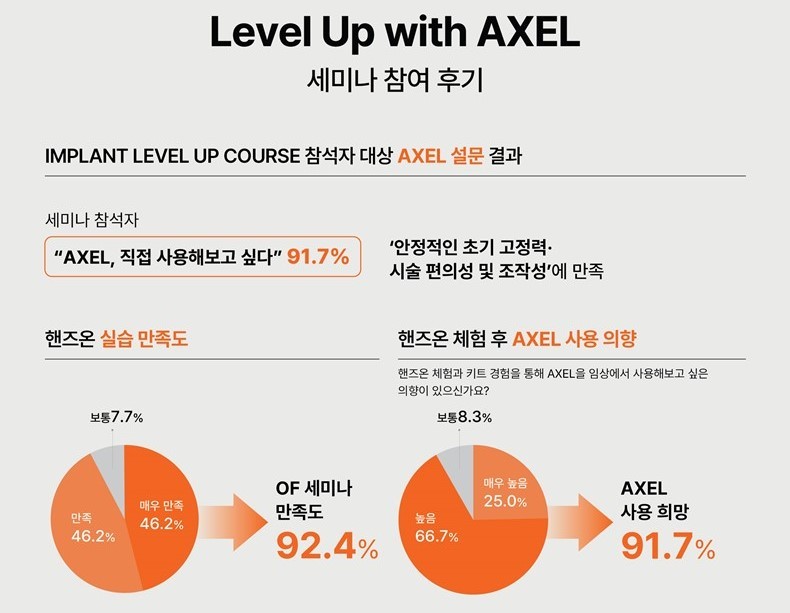 이번 설문은 지난 8월 23일 덴티스 서울 문정캠퍼스에서 시작돼 11월까지 총 10회 진행된 ‘AXEL’ 론칭 후 첫 공식 세미나인 ‘IMPLANT LEVEL UP COURSE’ 참석자를 대상으로 이뤄졌으며, 세미나는 ‘AXEL’ 개발에 참여한 조용석 원장(조용석김세웅치과)이 직접 설계 의도와 임상적 강점을 설명하며 교육의 완성도를 더했다.