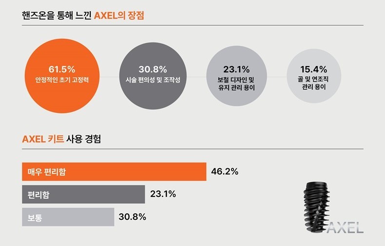 또한 실습 과정에서 ‘AXEL’의 어떤 점이 인상적이었는지 묻는 질문(중복응답)에서는 ‘안정적인 초기 고정력’이 61.5%로 가장 높은 응답을 얻었다. 이어 △‘시술 편의성 및 조작성’이 30.8% △‘보철 디자인 및 유지 관리 용이’가 23.1% △‘골 및 연조직 관리 용이’가 15.4%로 뒤를 이었다.