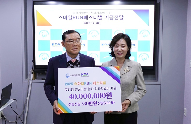 [치과신문_최학주 기자 news@sda.or.kr] 대한치과의사협회(회장 직무대행 마경화·이하 치협)가 ‘2025 스마일 Run 페스티벌’에서 마련된 수익금 4,000만원과 오스템 전동칫솔 200개를 스마일재단에 전달했다.