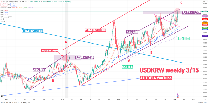 이란과 미국 간 군사적 긴장이 고조되면서 국제 유가와 함께 원달러 환율이 빠르게 상승했다. 단기간에 환율이 전고점(1,485)을 넘어서 1,500원을 장중 돌파하는 수준까지 올라오면서 시장의 관심은 자연스럽게 ‘어디까지 상승할 것인가’에 집중되고 있다. 이러한 환율의 고공행진은 단순히 전쟁이라는 단일 지정학적 리스크뿐만 아니라 현재 환율이 놓인 구조적인 사이클 흐름에서 발생하는 상방 압력이 결합된 결과로 볼 수 있다.