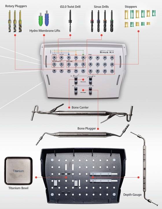 CRESTAL SINUS KIT는 Ø2.0 Twist Drill(1), Sinus Drills(4), Rotary Pluggers (3), Hydro Membrane Lifts(2), Stoppers (11), Bone Carrier(1), Bone Plugger(1), Depth Gauge(1), Titanium Bowl(1) 등으로 구성됐다. 이 중 Sinus Drill이 단연 눈길을 끈다. 상악동 시술 시 Sinus Membrane을 보호하면서 Sinus Floor를 신속하게 절삭할 수 있도록 Round Dome type으로 개발됐으며, 유니크한 디자인이 단연 돋보인다.