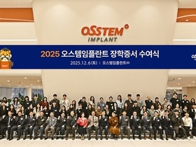 [치과신문_신종학 기자 sjh@sda.or.kr] 오스템임플란트(대표 김해성·이하 오스템)가 지난 12월 6일 마곡 본사에서 ‘2025년 장학증서 수여식’을 진행했다. 이날 행사에는 전국 11개 치과대학 및 4개 임상치의학대학원에서 선발된 167명의 오스템 장학생 가운데 100여명이 직접 참석해 각 학교 학장 및 교수에게 뜻깊은 장학증서를 전달 받았다. 이날 수여식에서 오스템 최규옥 회장은 오스템 장학증서를 받은 모든 학생에게 축하의 메시지와 함께 치과의사 선배로서 당부도 잊지 않았다. 최규옥 회장은 “치과의사라는 직업을 많은 사람이 선망하지만, 정작 치과의사 본인들은 만족하지 못하다는 설문결과를 봤을 때 참으로 안타까웠다”며 “여러분이 어떤 생각과 사명을 갖고 사느냐에 따라 치과의사라는 직업에 대한 만족도는 물론, 삶의 행복도 달라진다는 것을 명심하길 바란다. 만족도가 높은 치과의사로 살기 위해서 무엇보다 환자에게 최선을 다하는 치과의사, 즉 환자의 마음을 이해해주고 진료에 정성을 다하는 치과의사가 되길 바란다”고 강조했다. 또한 최 회장은 “중요한 것은 실력 있는 치과의사가 돼야 한다”며 “실력 있는 치과의사가 되기 위해 지금은 물론, 앞으로도 지속적으로