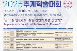 [치과신문_신종학 기자 sjh@sda.or.kr] 대한치과이식임플란트학회(회장 김성민·이하 KAID)가 지난 10월 26일 서울대치과병원에서 2025년도 추계 학술대회를 개최했다. ‘불가능한 임플란트 진료, KAID에서 가능하게’를 대주제로, ‘AI와 디지털이 여는 임플란트 진료의 미래’를 핵심 토픽으로 진행된 이날 학술대회는 김성민 회장 취임 후 열리는 첫 번째 학술대회로, KAID의 내·외적 변모된 모습을 볼 수 있는 기회가 됐다는 평가다. 특히 이날 학술대회는 온라인 플랫폼 기반 강의 및 현장 강의를 병행해 진행돼 실시간 송출로 원거리 회원의 참여가 더욱 확대될 수 있다는 가능성을 볼 수 있었다. 또한 AI 실시간 동시통역 시스템 도입으로 강연의 접근성과 국제적 확장성을 가늠할 수 있었다는 평가다. 학술대회에서는 △임플란트 시술에서 내일 당장 적용 가능한 새로운 치료법과 기전 △Key to Implant Success △치주적 관점을 접목한 임플란트 접근법 △영상치의학 진단 △임플란트 합병증의 예방 및 해결 전략 그리고 자유연제 구연발표 등 크게 6개 세션이 2개 강연장에서 이뤄졌다. 이번 학술대회는 기존 KAID 틀을 깨고, 다양한 연자 구성과 수준