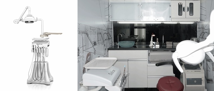 또한 별도의 소독 시스템 공간을 마련, 세척하고 보관할 수 있도록 했다. 뿐만 아니라 세면대와 대형 물통을 설치하는 등 상하수도 처리도 원활하도록 고성능 콤프레셔를 외부에 설치해 소음을 최소화 했다. 진료 공간의 내부 높이는 약 180cm로, 일반 성인이 서서 움직이는 데 큰 불편함이 없도록 했으며, 술자와 스탭의 공간도 최대한 넓게 사용할 수 있도록 배려했다. 한일치과산업이 선보이는 컴팩트한 사이즈의 Dolce가 봉사차량 내부에 탑재돼 있을 뿐 아니라 슬라이딩 테이블 등 활용공간이 충분하도록 설계됐다.