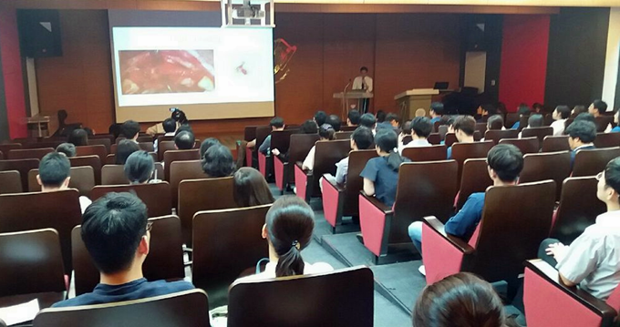 바통을 이어받은 김영택 교수(국민건강보험공단 일산병원)는 ‘Overcoming the narrow ridge’를 주제로 치주질환 혹은 여러 다른 병변으로 인해 치아가 발치된 경우 나타날 수 있는 얇은 형태의 치조골 증례에 대한 해법을 다양한 증례와 함께 제시했다. 임상가들이 선택할 수 있는 방법으로 치조능 분할술과 확장술, 골유도재생술 등 다양한 수술기법들을 증례와 함께 적응증을 중심으로 설명함으로써 참석자들의 이목을 집중시켰다.