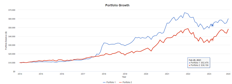 1) 수익률 - 비트코인을 포함한 자산배분 포트폴리오1의 연평균 수익률은 19.8%로 나스닥100 ETF ‘QQQ’ 100% 포트폴리오2의 17.1% 보다 높았다.