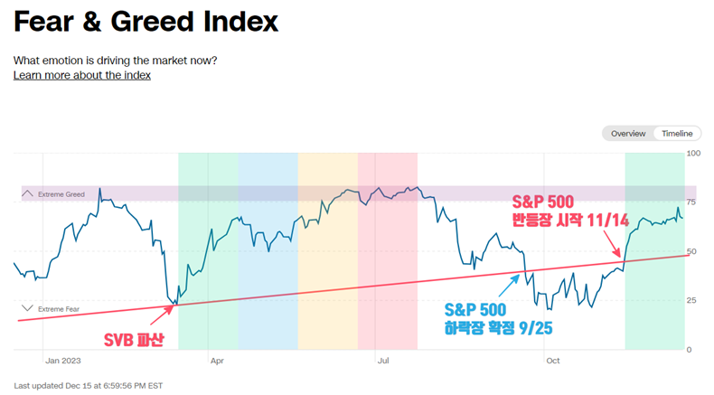 2023년 상반기에는 이 추세선을 지지하면서 상승장이 지속됐다. 지난 상반기 상승장을 4가지 색으로 표시했는데, 표시된 색 하나가 1개월을 의미한다. 지난 7월 공포탐욕지수가 극단적 탐욕구간에 머무르면서 최고점을 높여가는 중에 7월 12일 6월 CPI 지수가 발표되자 미국증시가 고점에서 하락하기 시작했다. 미국 증시는 4개월 정도 조정 받은 후 9월 25일 기준으로 공포탐욕지수의 상반기 지지선을 이탈하며 하락장을 확정지었다.