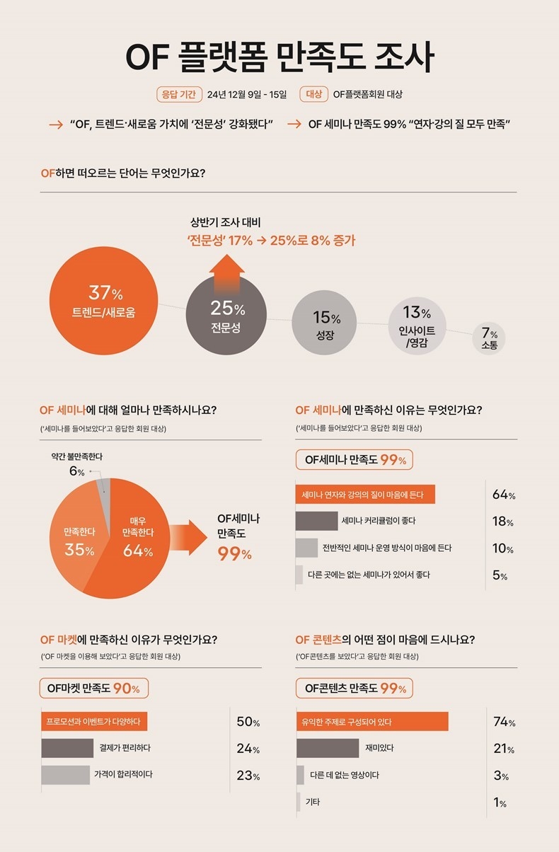 이번 조사에서는 OF의 브랜드 인지도 및 서비스 전반에 대한 만족도를 평가했으며, △세미나 △마켓 △콘텐츠 등 모든 부문에서 높은 만족도를 기록했다.