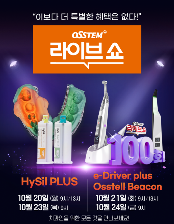 지난 2023년 4월 4일 방송을 시작한 ‘오스템 라이브쇼’가 오는 오늘(20일)부터 오는 10월 24일까지 △인상재 ‘HySil PLUS’ △무선전동 토크 드라이버 ‘e-Driver plus’ △ISQ 측정기 ‘Beacon’ 특가 프로모션을 진행한다. 해당 제품들 모두 라이브쇼를 통해 치과의사들에게 많은 사랑을 받은 검증된 제품들로 더욱 많은 혜택으로 준비했다고 오스템 측은 전했다.