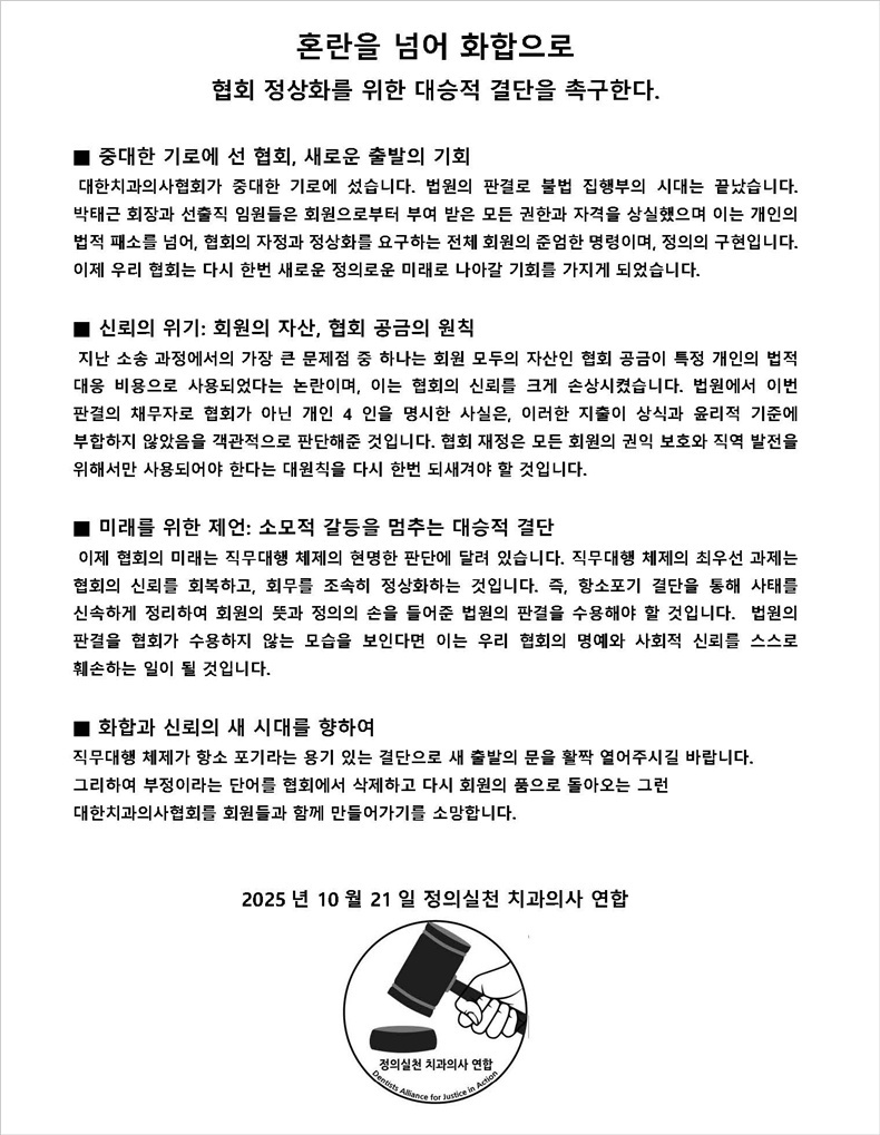 또한 정의실천치과의사연합(대표 박창진·이하 정실치연) 측도 성명을 내고 “협회 정상화를 위한 대승적 결단을 촉구”하고 나섰다. 박태근 회장 등에 대한 직무집행정지가 결정된 이상 치협은 당선무효 소송에 대한 ‘항소’를 포기해야 한다는 것이다.