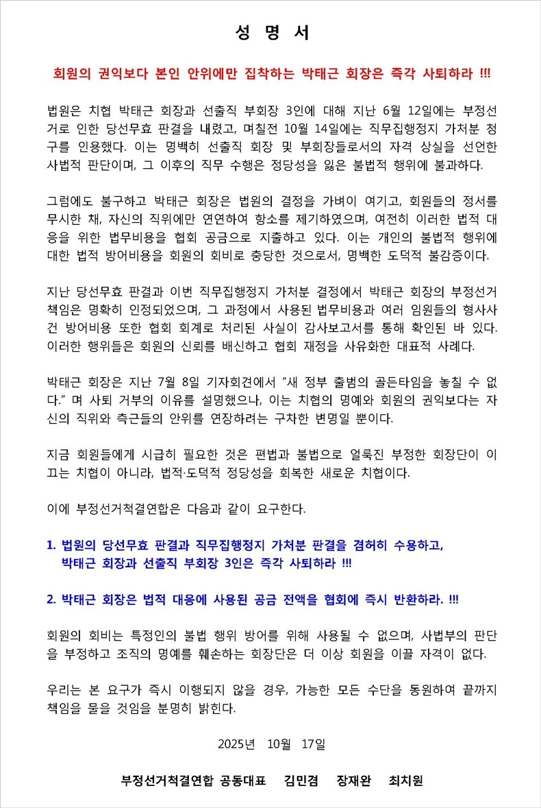 부척연은 당선무효 1심 판결과 이번 직무집행정지 가처분 결정에서 박태근 회장의 부정선거 책임은 명확히 인정됐다는 것. 그 과정에서 사용된 법무비용과 여러 임원들의 형사사건 방어비용 또한 협회 회계로 처리된 사실이 감사보고서를 통해 확인됐는데, 이는 회원의 신뢰를 배신하고 협회 재정을 사유화한 대표적 사례라는 게 부척연의 주장이다.