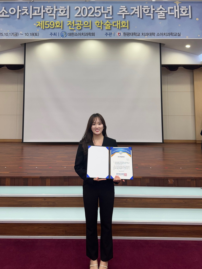 [치과신문_이가영 기자 young@sda.or.kr] 전북대학교치과대학(이하 전북치대) 소아치과 박유라 석사과정생이 대한소아치과학회 추계 학술대회에서 ‘구연발표 우수상’을 수상했다. 지난해에 이어 2년 연속 수상으로, 연구역량과 학문적 성취를 다시 한번 인정받았다.