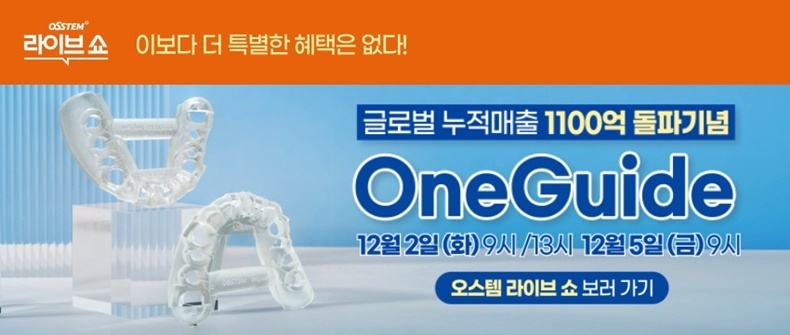 [치과신문_신종학 기자 sjh@sda.or.kr] 오스템임플란트(이하 오스템)의 ‘오스템 라이브쇼’가 올해 9월 기준 글로벌 누적 매출 1,100억원을 돌파한 디지털 가이드 ‘OneGuide’ 특집 방송을 오늘(12월 2일)과 오는 12월 5일 편성한다. 글로벌 치과 임상의들로부터 인정받은 ‘OneGuide’를 다양한 혜택으로 선보이는 만큼 많은 문의가 이어질 것으로 기대된다.