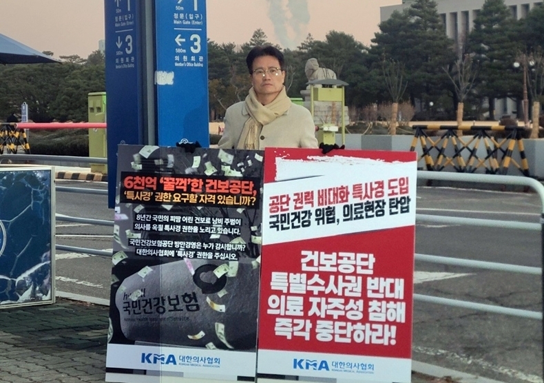 [치과신문_김영희 기자 news001@sda.or.kr] 대한의사협회(회장 김택우·이하 의협)가 국민건강보험공단 특별사법경찰(이하 특사경) 권한 부여 저지를 위한 1인 시위에 돌입했다.