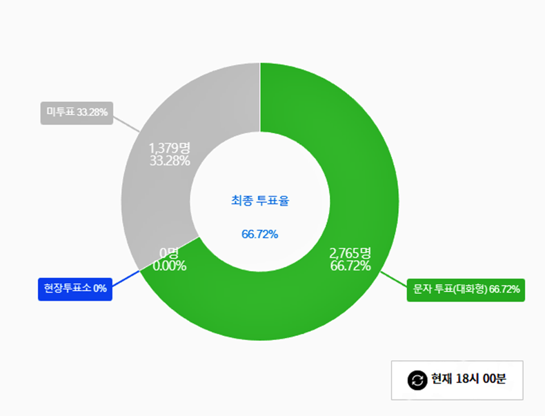 서울지부 선거관리위원회(위원장 신화섭)는 2월 10일(오늘) 오후 6시 제40대 회장단선거 투표를 마무리한 결과 최종 투표율은 66.72%(2,765명)라고 밝혔다. 미투표자는 전체 유권자의 33.28%에 해당하는 1,379명이다.