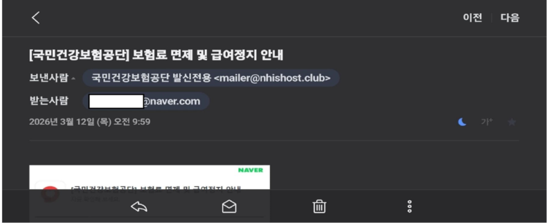 최근 ‘보험료 면제 및 급여정지 안내’라는 제목의 이메일이 발송되는 사례가 확인됐다. 해당 메일은 건보공단을 사칭한 것으로, 발신 주소는 ‘mailer@ nhishost.club’인 것으로 확인됐다. 공단 측은 이와 같은 메일이 공식 안내가 아니며, 이용자들이 혼동하지 않도록 각별한 주의를 당부했다.