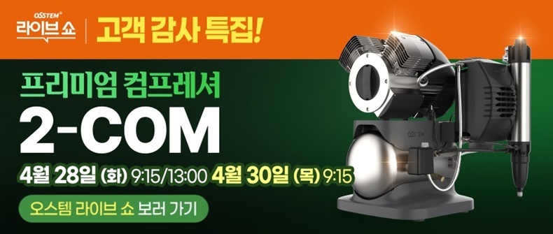 [치과신문_신종학 기자 sjh@sda.or.kr] 오스템임플란트(회장 최규옥·이하 오스템)가 운영하는 OSSTEM 라이브쇼가 오는 4월 28일부터 30일까지 프리미엄 컴프레셔 ‘2-COM’을 30대 한정 판매를 진행한다. 해당 제품은 우수한 내구성과 환자 감염관리에 용이해 출시 후 개원의들의 관심이 높아 많은 관심이 집중될 것으로 기대된다.