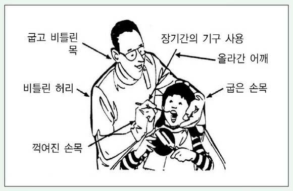 그림2. 치과의사는 불편한 자세로 고정된 채 장시간 진료를 하기 쉬우므로, 근골격계 질환이 유발되기