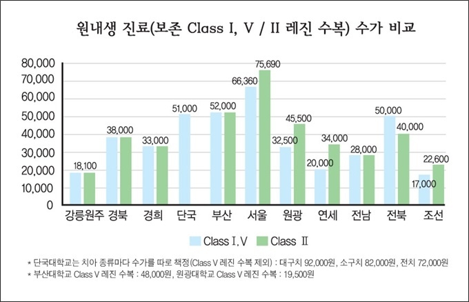따라서 이번 기사에서는 원내생들이 가장 보편적으로 시행하는 진료 항목을 몇 가지 선별, 각 대학별로 진료 수가를 비교해보았다. 치주 스케일링 및 치근활택술, 외과 발치, 보존 근관치료 등의 보험 진료는 제외했으며, 보존 Class I, V 및 Class Ⅱ 및 보철 Gold, PFG Crown 수가를 학교별로 조사했다. Gold, PFG 외에도 지르코니아, 세라믹, PFM Crown 등 다른 재료로 수복 가능한 학교들도 있었으나 전국 학교간 수가 비교를 위해 제외했다.