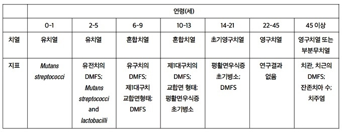 유치열부터 혼합치열기, 그리고 영구치열기로 이환되는 과정을 지켜보며 소아치과의사로서 가지게 되는 생각은 제1대구치의 운명은 이미 유치열에서부터 어느 정도 결정된다는 것이다. 과거의 우식 경험은 앞으로 발생 가능한 치아우식증을 예측하는 데 가장 유용한 지표다. Powell(1998)에 따르면 연령대별로 임상적인 우식예측지표는 달라지게 되는데, 만 6~9세의 아동에서 중요한 임상적 우식예측지표는 유구치의 우식경험치면 지수(decayed/missing/filled surface(DMFS) index)다. 즉 과거의 우식 경험을 토대로 새로 맹출하는 제1대구치 및 영구치의 향후 우식 발생 가능성을 예측할 수 있으며 이를 예방적 치료에 접목할 수 있다.